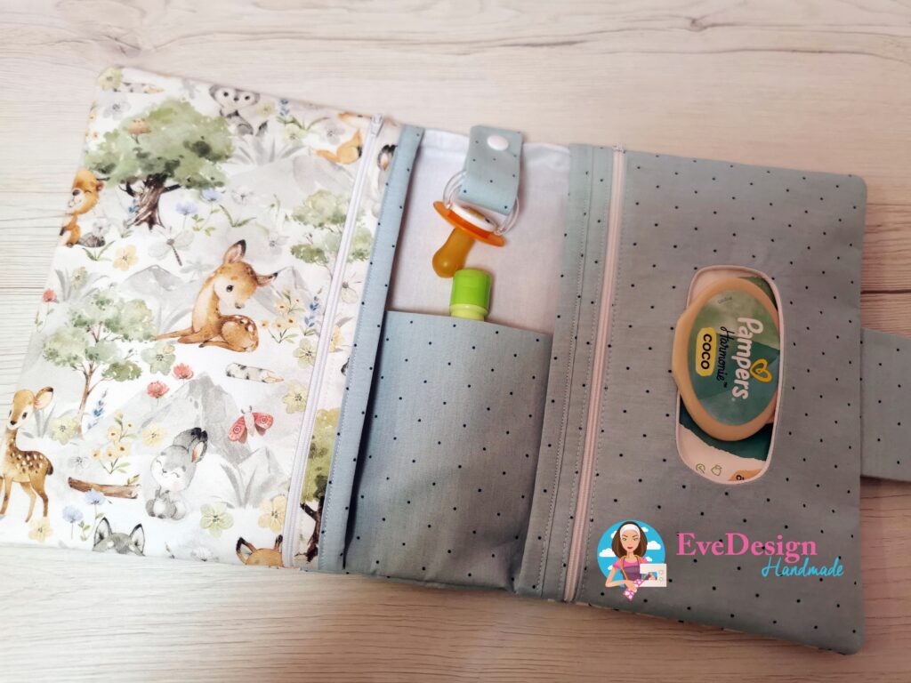 🦌 Átlátható, rendszerezett kialakítás: A cipzáras popsitörlős rekesz mindig kéznél van, a tágas belső zsebekben pedig kényelmesen elfér pelus, krém, cumi, sőt még egy váltóruha is.