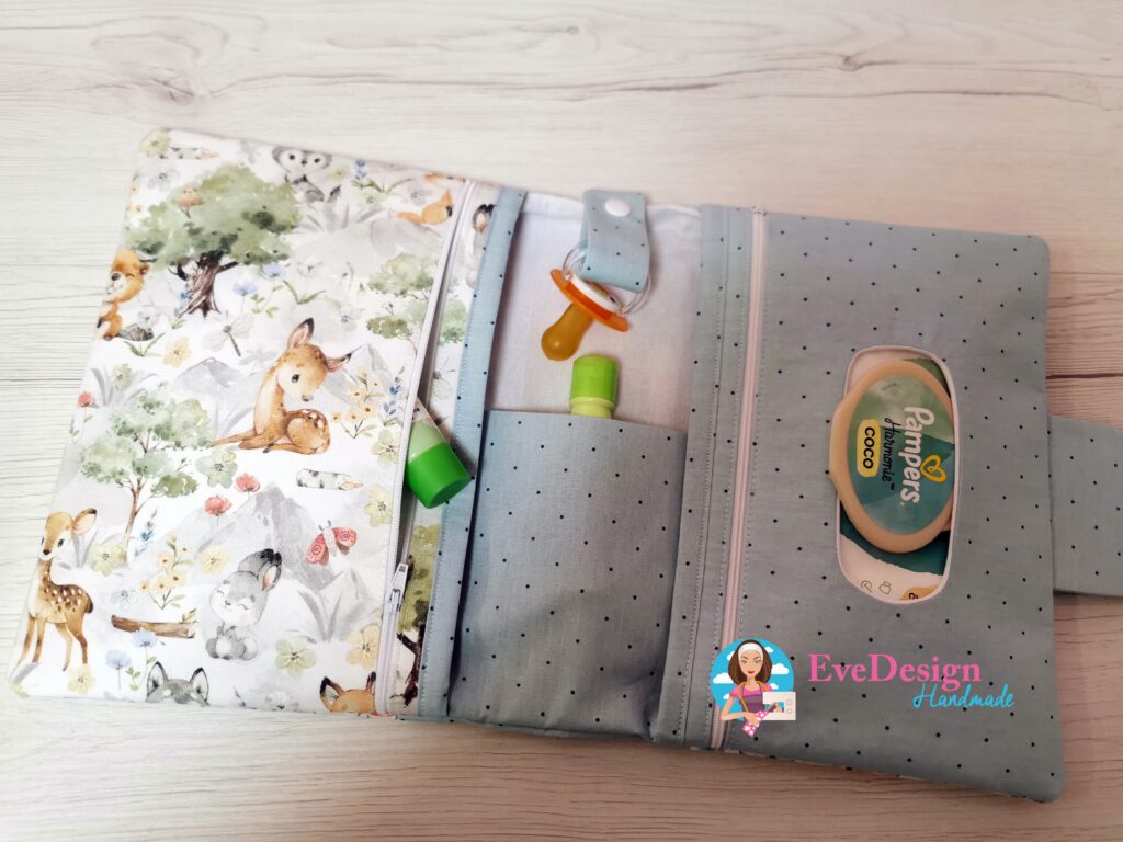 A puha szürke textil és a mesés erdei mintás pamut együttese egyszerre megnyugtató és stílusos – a legjobb társ minden anyukának, aki szereti, ha a praktikusság találkozik a szépséggel. 🍃