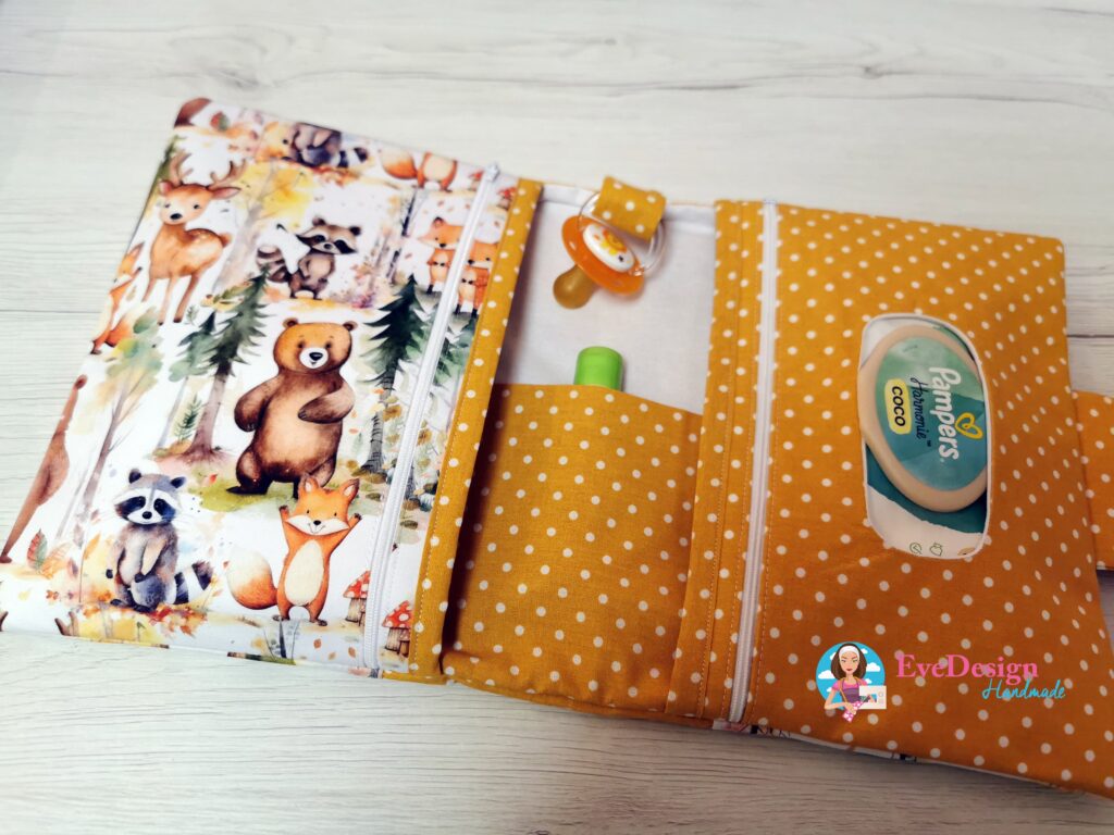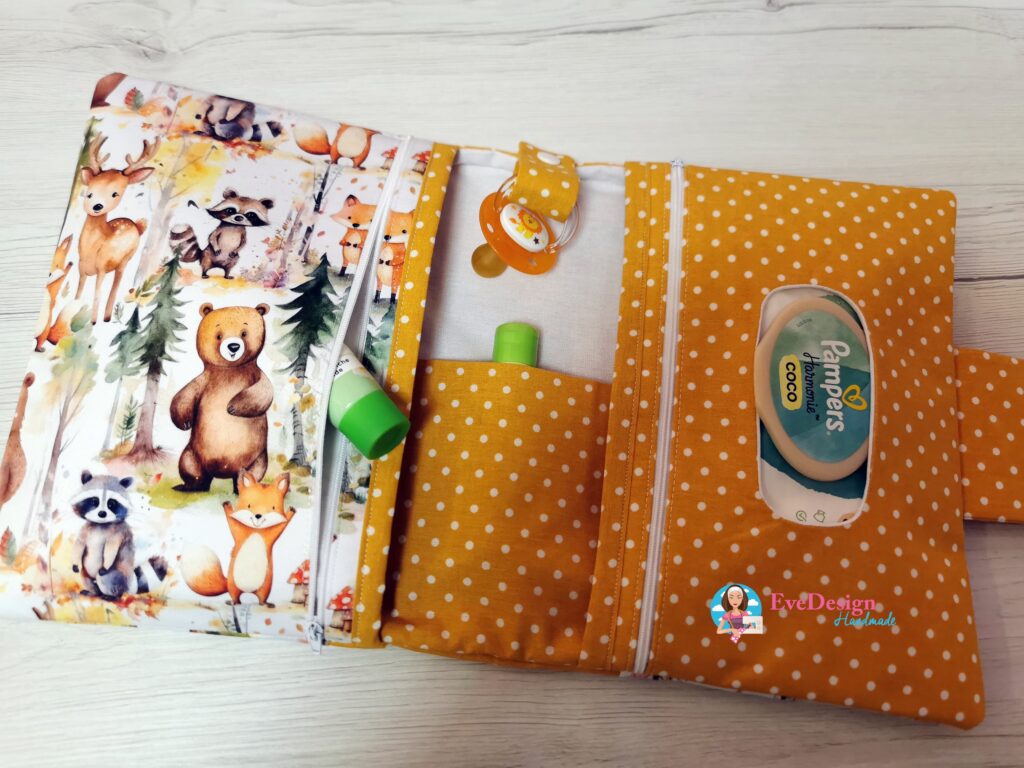 A dupla cipzáros pelenka táskánál a popsitörlős rész cipzárral záródik, így ha kevesebb a törlőkendő a csomagban akkor sem mozdul el a helyéről.