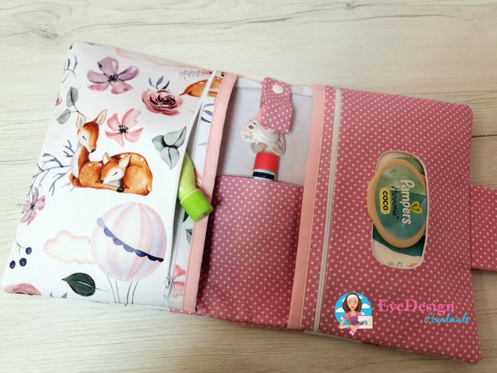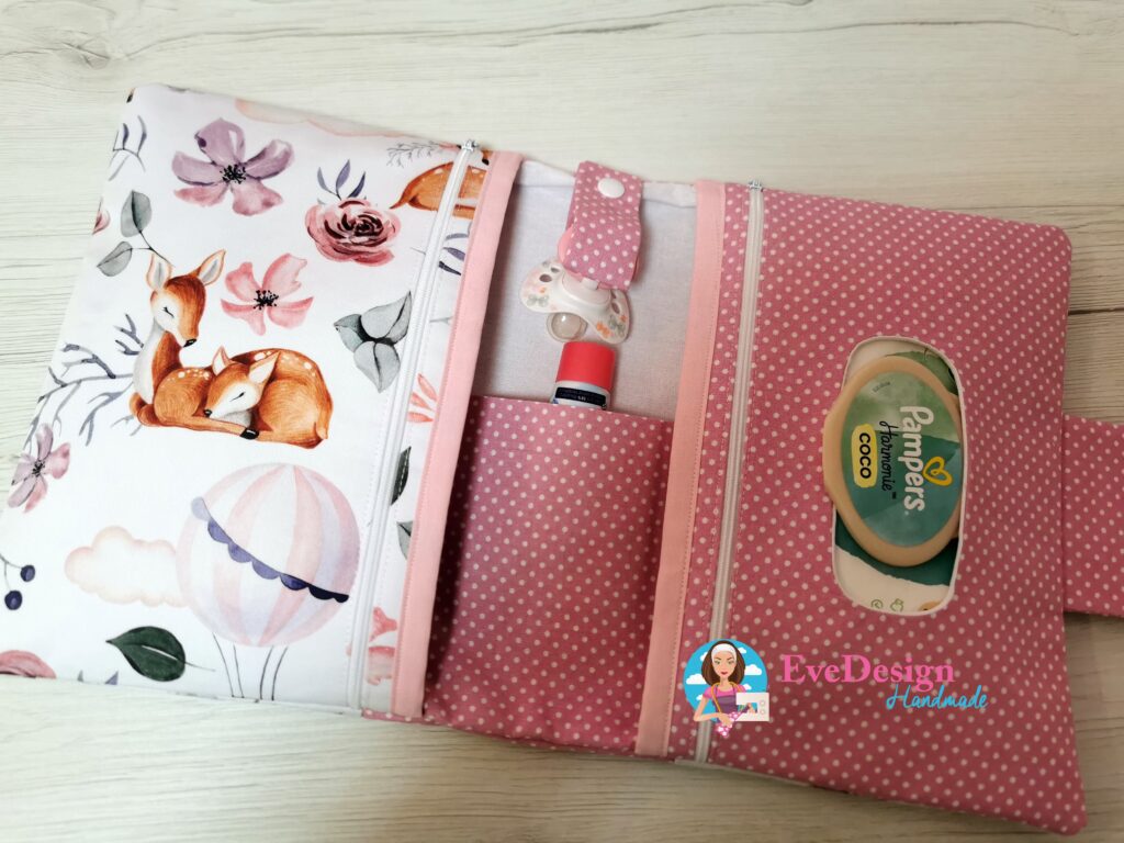 A dupla cipzáros pelenka táskánál a popsitörlős rész cipzárral záródik, így ha kevesebb a törlőkendő a csomagban akkor sem mozdul el a helyéről.